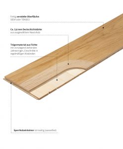 Das hochwertige 2-Schicht-Parkett BILAflor® vereint die Vorteile eines Klebeparketts mit jenen eines Fertigparketts und verfügt über eine Trägerschicht aus Fichten-Rifts, während Sperrholz-Einleimer
